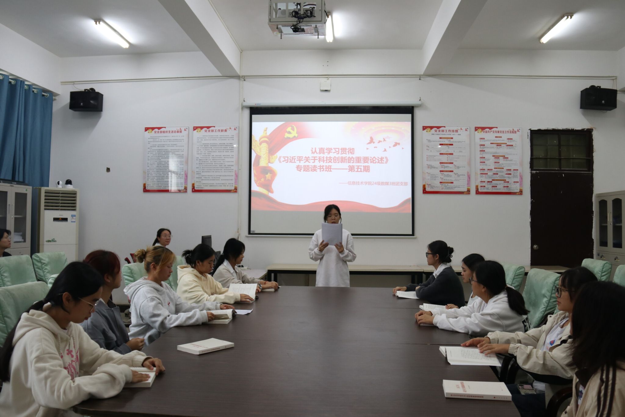 活动开始,同学们认真研读了《深入学习习近平关于科技创新的重要论述》。随后,王秋菊同学结合前期的学习内容,带领大家深入探讨了科技创新的重要性,使同学们对“创新发展”服务于协调、绿色、开放、共享发展的理念有了更为深刻的认识。她着重指出,“创新发展”在发挥经济增长“第一动力”作用的同时,还需致力于解决发展不平衡、人与自然和谐共生、社会公平正义等关键问题,以向世界发展贡献中国智慧。