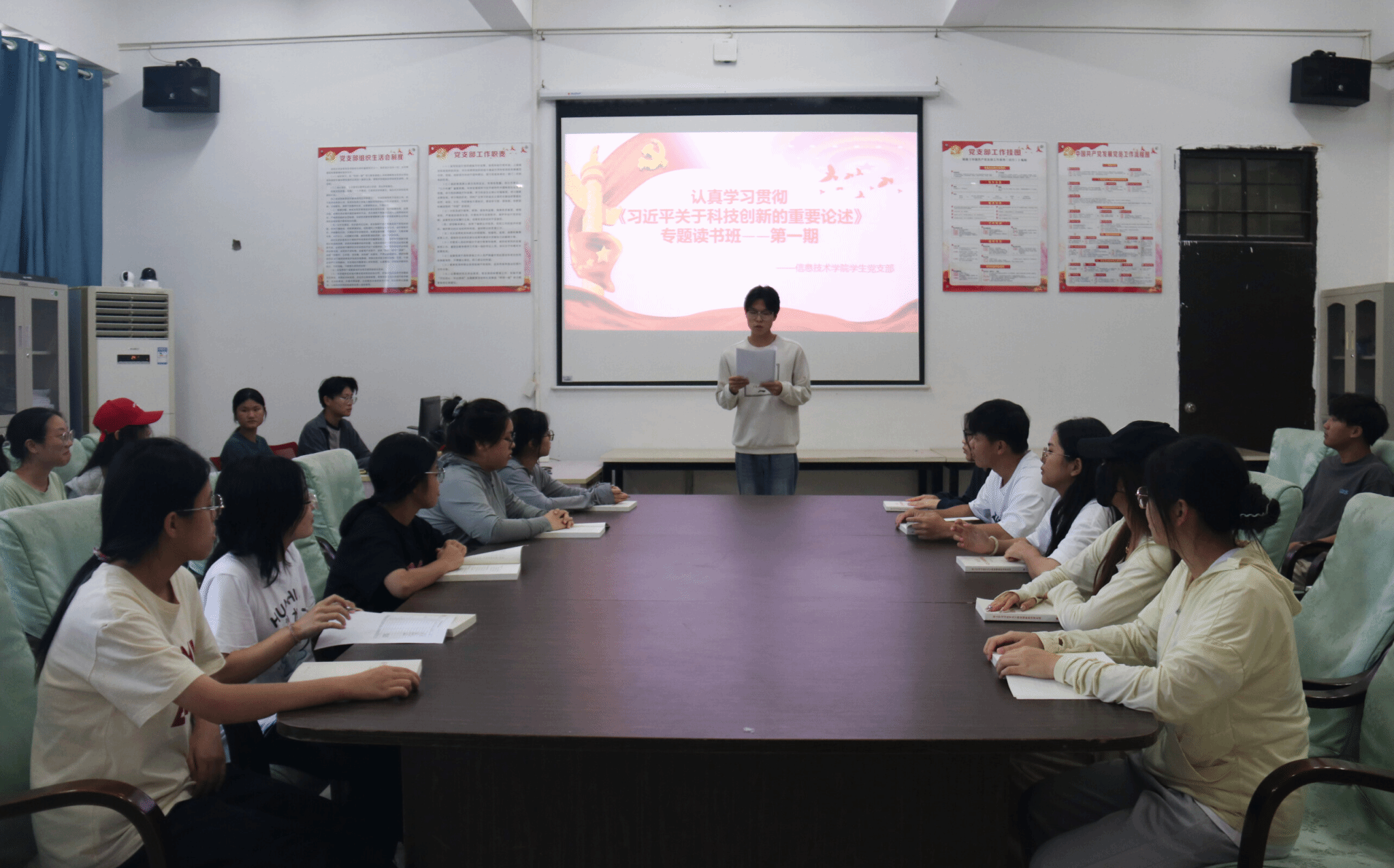为深入学习贯彻《深入学习习近平关于科技创新的重要论述》,10月31日,437bwin必赢国际员工党支部在4-213开展专题读书班第一期,由张文博同学主持,入党申请人、共青团员以及入党积极分子代表共同参加。