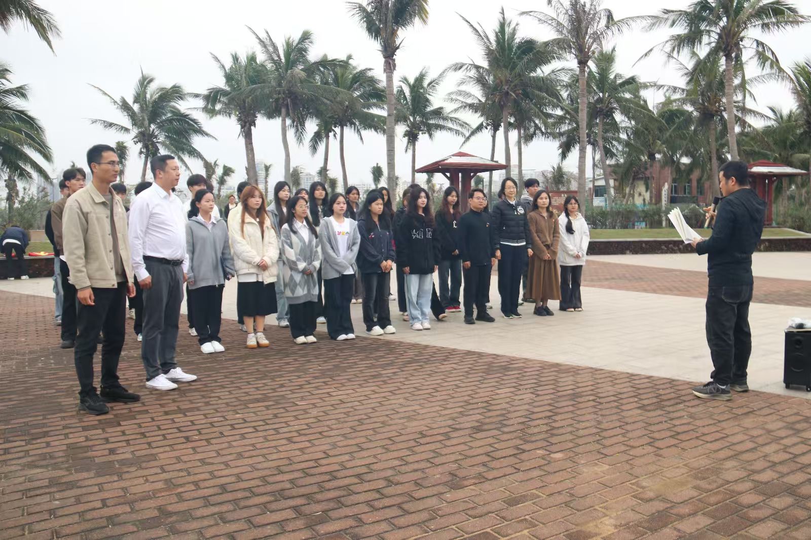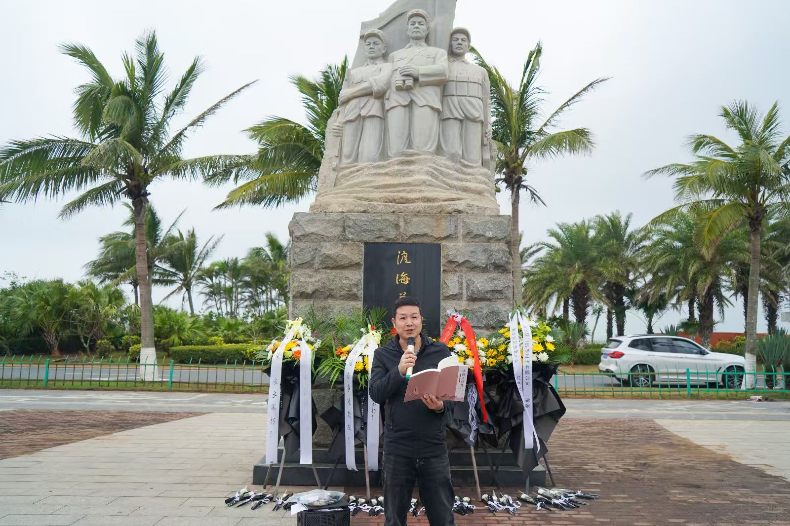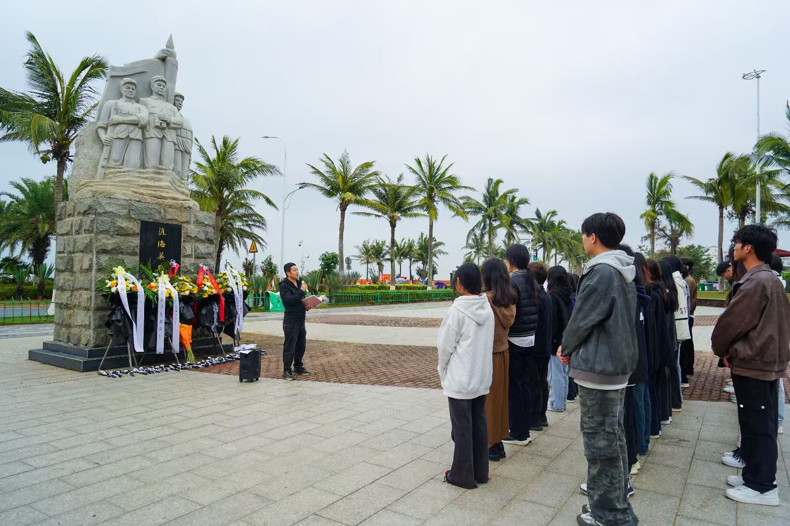 在党课上,教师党支部书记康东以渡海英雄纪念碑为背景,生动地还原了70多年前白沙门战役的场景。他讲述了解放军将士在渡海登陆海南岛作战中的英勇事迹:在枪林弹雨中,战士们以木船为舟、以信念为帆,突破敌军防线,用鲜血和生命换来了海南岛的解放。教师党支部书记康东强调,解放海南岛战役是党史上的重要篇章,英烈们用忠诚和担当书写了革命史诗。他勉励青年学子,要传承红色基因,赓续革命精神,从党史中汲取奋进力量,以英烈为榜样,在新时代的征程中勇往直前。
