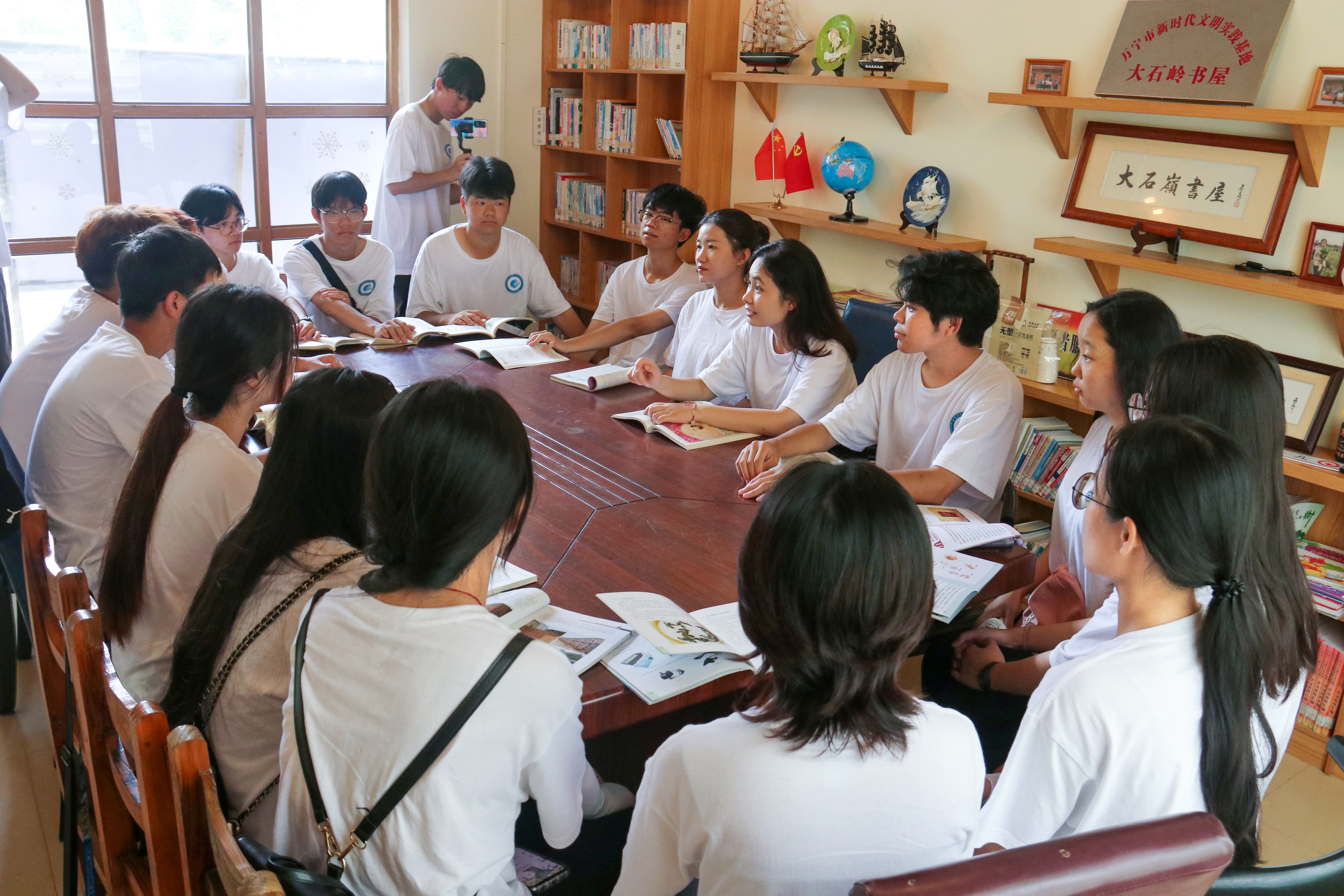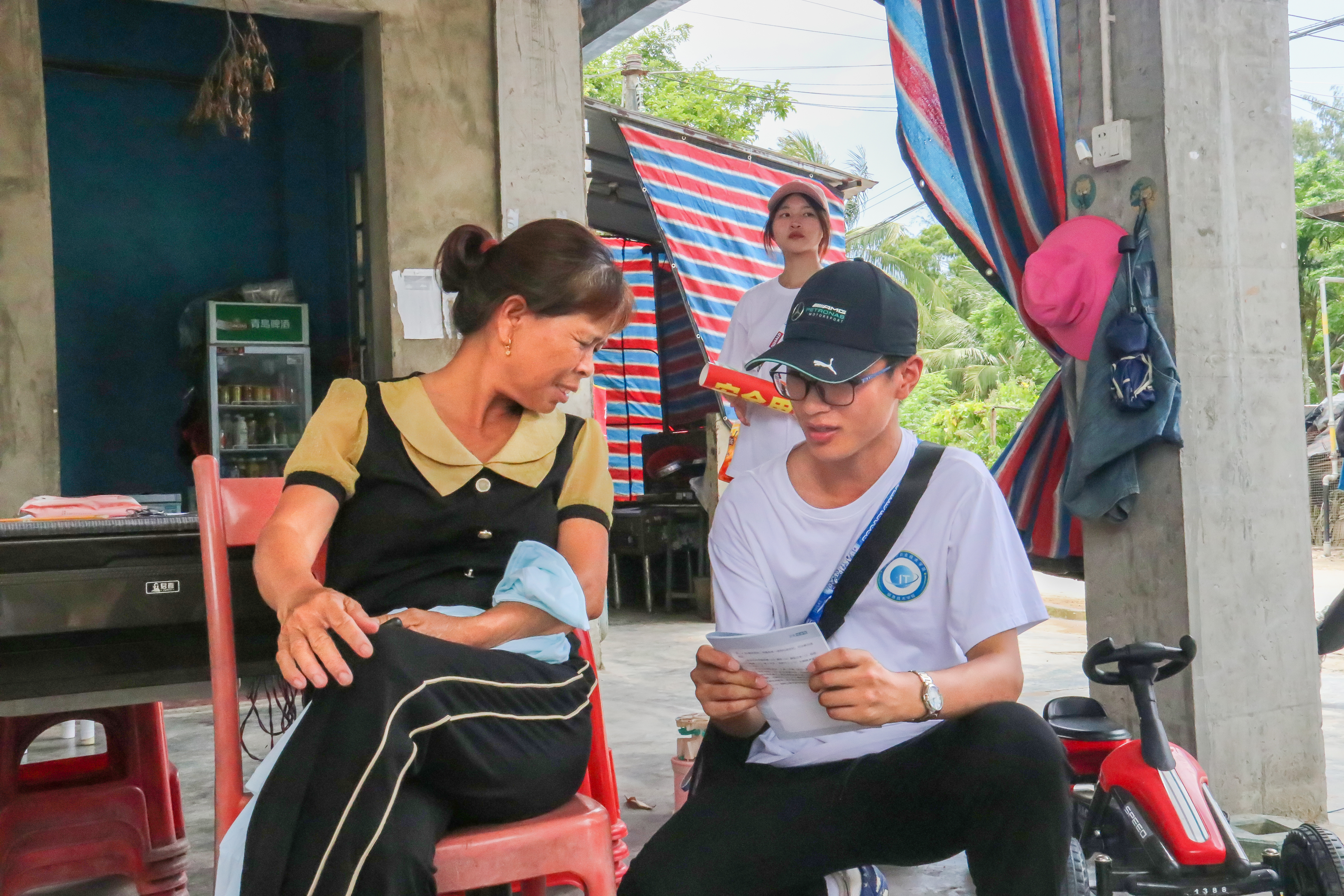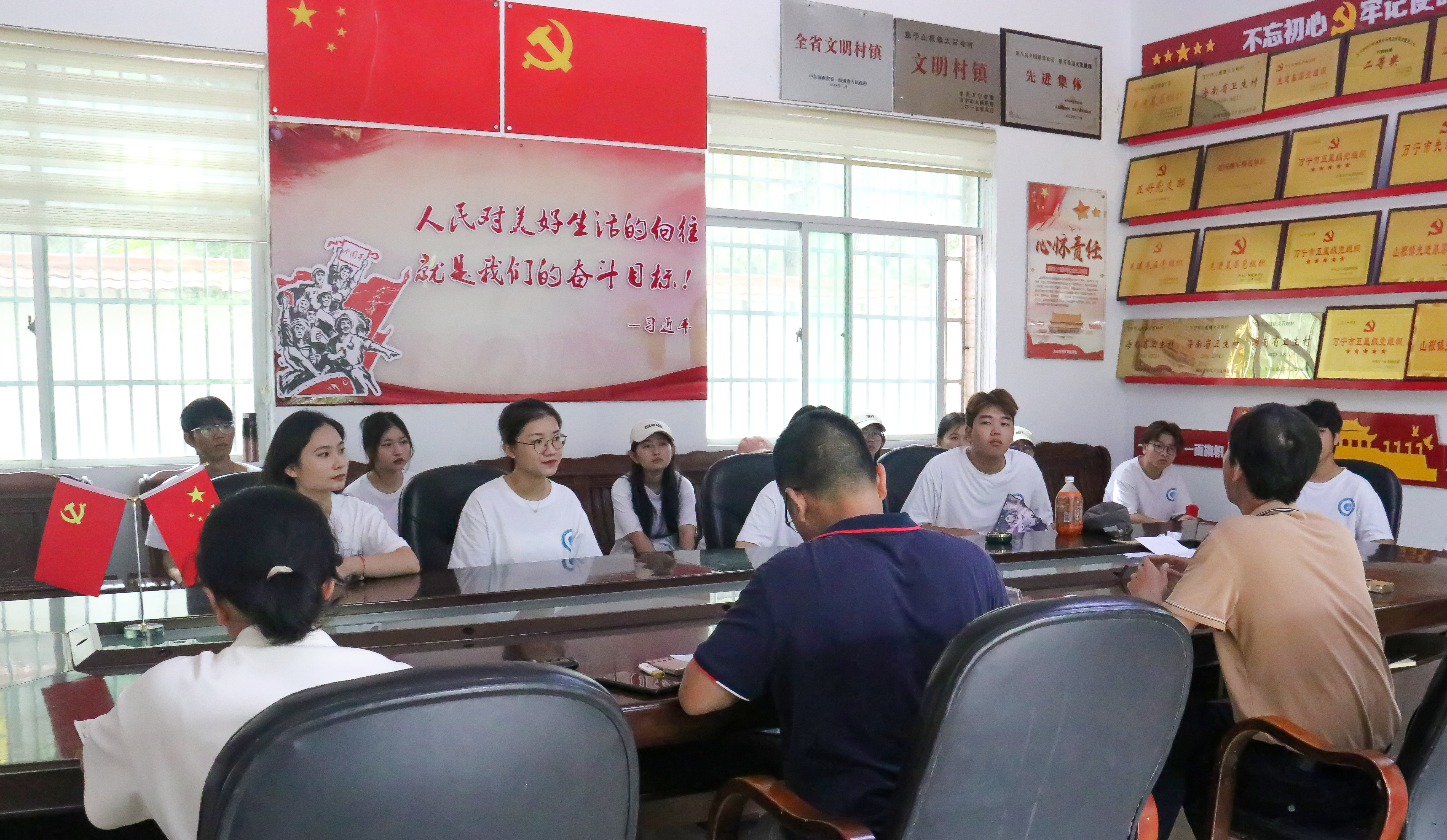 在大石岭村居民委员会,村干部冯启浪向大家介绍了大石岭村的建立背景、发展历程以及今天所取得的成就,并带领大家参观了村中的陈列室、红军井等红色文物,在琼崖革命中,大石岭村为革命奋斗谱写了浓墨重彩的一笔。紧接着,村干部冯启浪带领大家实地参观了大石岭村的建设情况,一同探访村集体创办的共享书屋、共享菜园、共享鱼塘等,立足乡情、村情,共同探讨文化传承和发展,挖掘乡村蕴含的价值和潜在的魅力。通过实地参观,队员们收获满满,在“学理论、长见识、强本领”的学习分享会中,大家结合自身依次分享收获与感受,刘宗坤同学表示此次领略了大石岭村的红色历史文化与建设风貌,切实感悟到乡村振兴发展的重要性。活动的最后,队员们与村民们亲切交谈,了解村民的生活现状,为村民们宣传防范肺结核、套代购、安全用火用电等知识,并有针对性地向村民们科普了“新农保、新农合”、“环境保护”、“农药使用”等相关知识,切实提高村民的安全防范意识,为当地发展建设贡献力量。