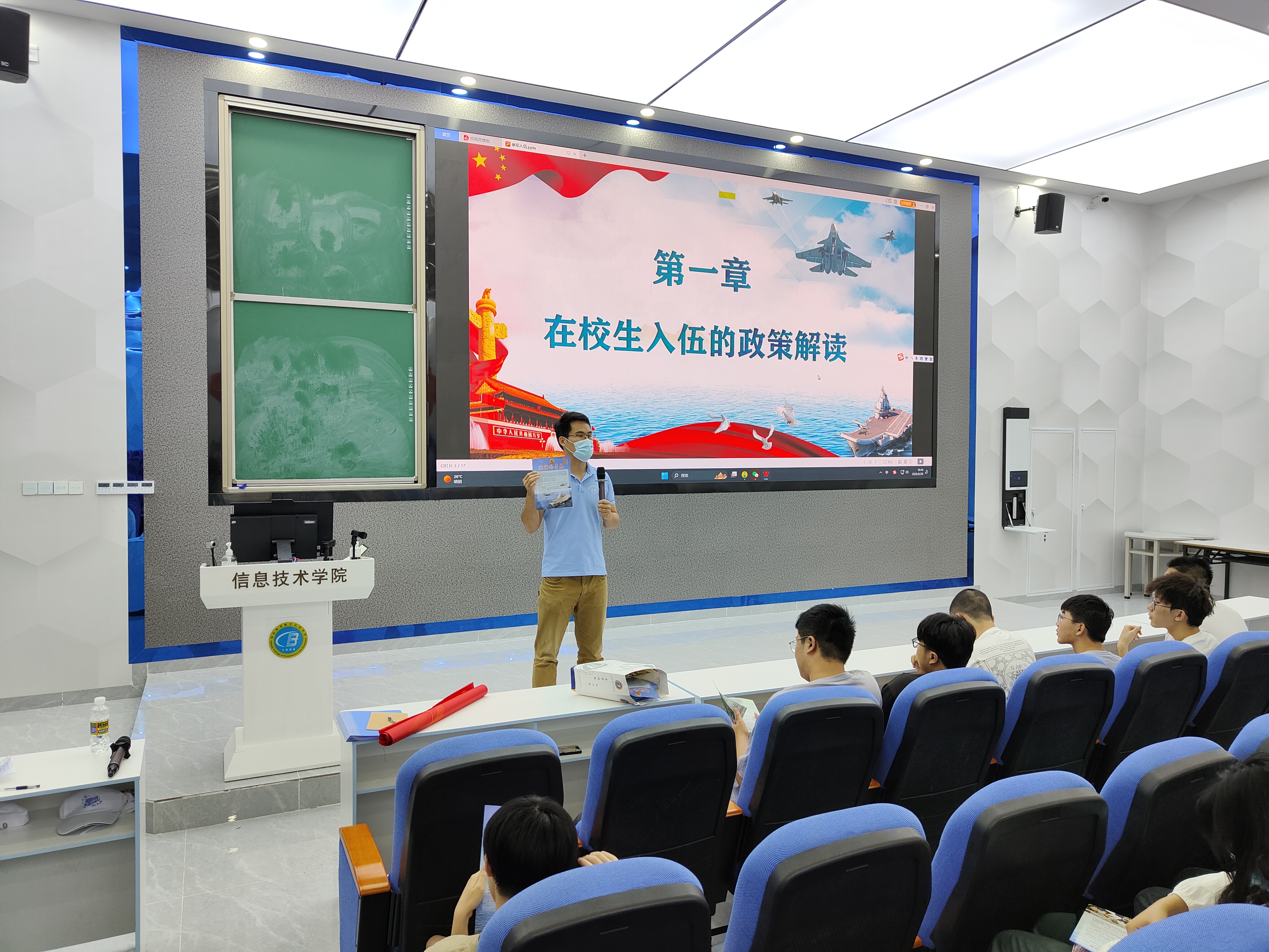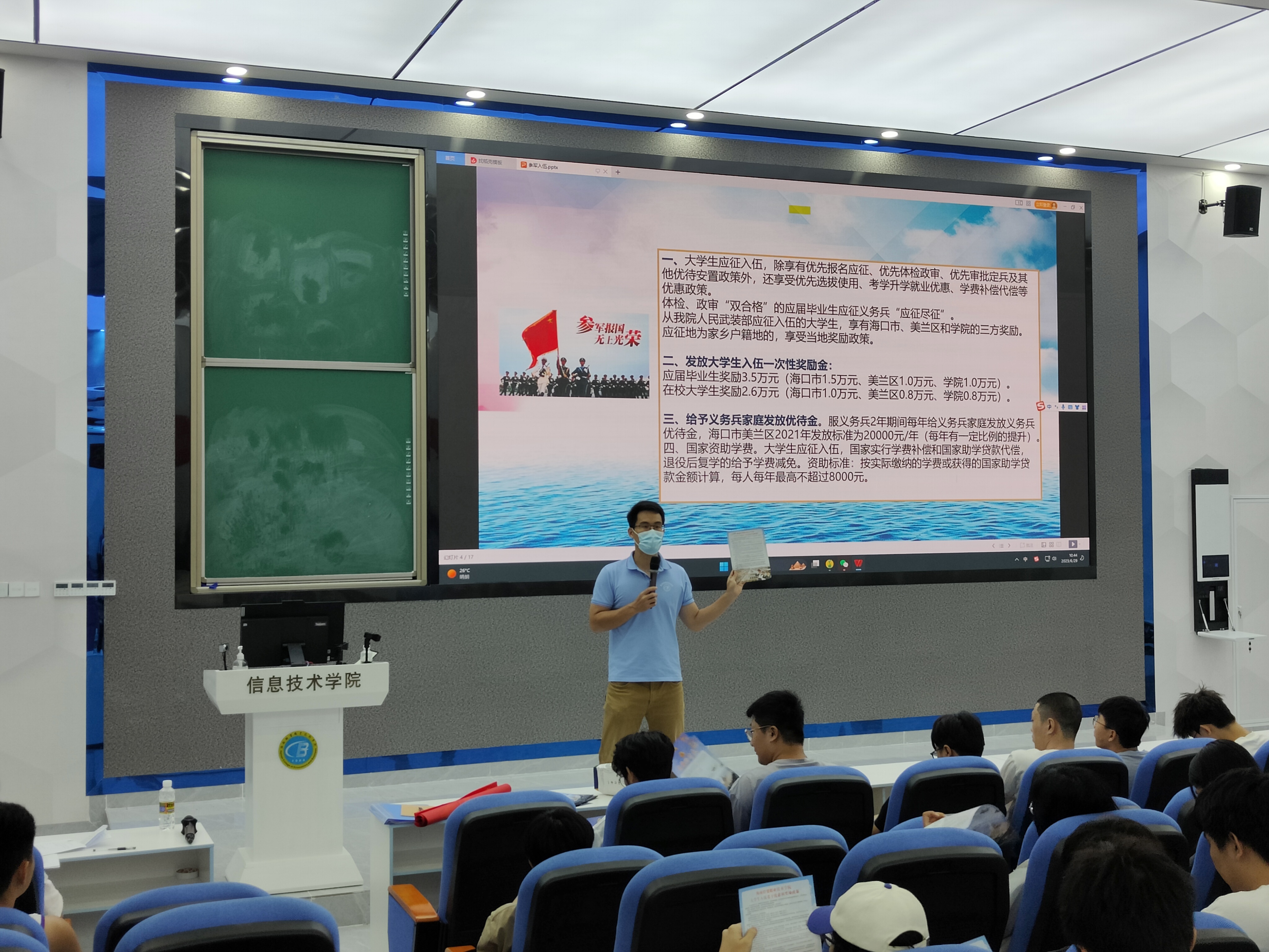 宣讲伊始,唐图老师给同学们观看2023年征兵宣传片,让信息学子热切感受到人民子弟兵对祖国的热爱、对社会的责任、对人民的守护。紧接着,唐图老师向全体同学详细解读了在校生入伍的优惠政策,老员工参军入伍不仅可以积攒一份与众不同的人生阅历,锤炼一种军人钢铁般的意志,还能积累到一份无形的精神财富,享受到政府赋予的各种优惠福利政策。