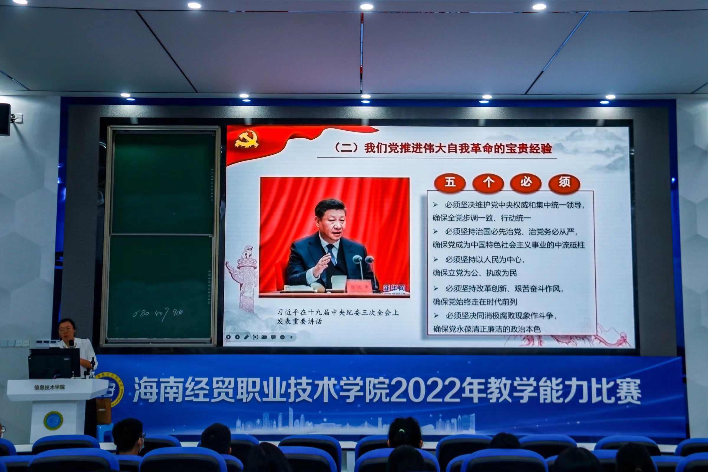 宣讲会上,常老师围绕党的自我革命看中国共产党“为什么能”为主题,并从勇于自我革命是党最鲜明的品格、党推进自我革命的实践成效和宝贵经验、新时代把党的自我革命推向深入三大方面进行详细讲解。此外,常老师沿着历史时间轴,通过电影《建军大业》和视频《延安整风》讲述了中国共产党一路的艰辛,并围绕“七个有之”、“四种形态”、“五个必须”等内容,让学子们进一步了解到党的自我革命,从严治党的成功经验,以及实践的重要性。