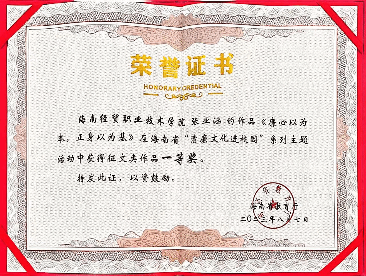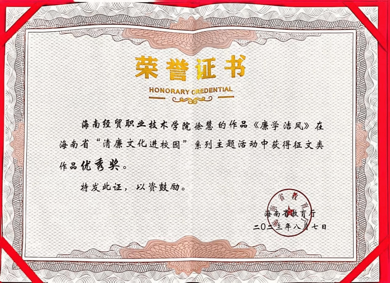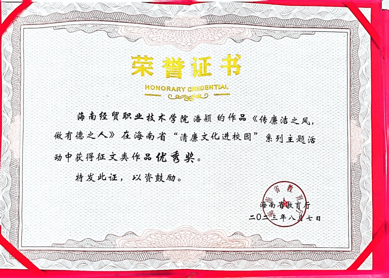 公司精心组织,广泛动员师生积极参与海南省教育厅2023年“清廉文化进校园”系列主题活动,创作了一批优秀的清廉文化作品。在公司师生的共同努力下,437bwin必赢国际张业涵同学荣获一等奖,徐慧、潘颖同学荣获优秀奖。这些作品展示了员工对清廉文化的深刻理解和独到见解,体现了公司在清廉文化建设方面的成果。期待未来在清廉文化教育和传承方面取得更多成绩,为营造风清气正的校园环境贡献力量。