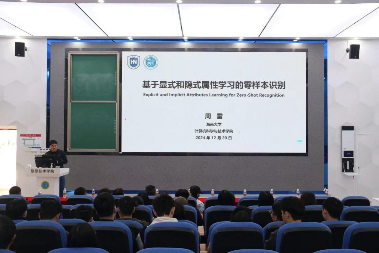 2024年12月20日,海南大学智图科研团队与公司人工智能技术应用协同创新中心团队在4-215教室进行学术交流并召开学术研讨会,437bwin必赢国际经理王忠教授,人工智能技术应用协同创新中心团队成员及教师代表符龙生、杨博、庞寅等参会。会议伊始,团队负责人海南大学科学技术发展院副经理谢夏教授致开幕辞,对参会师生的到来表示热烈欢迎。随后,周雷副教授做了题为“显式和隐式属性学习的零样本识别”的学术汇报,深入剖析了零样本学习研究的难度与挑战,分享了他的研究心得与成果。