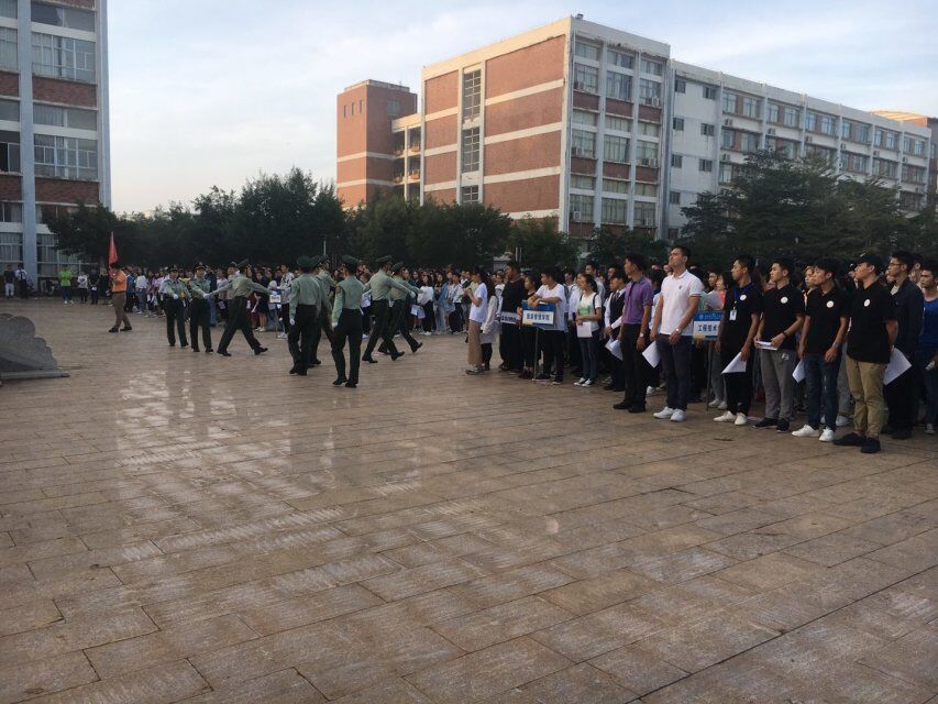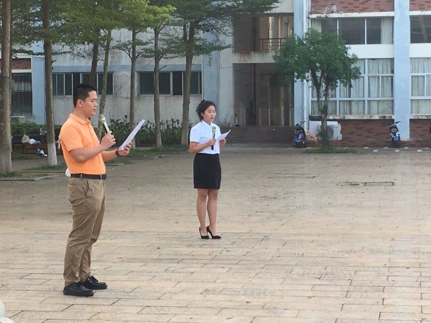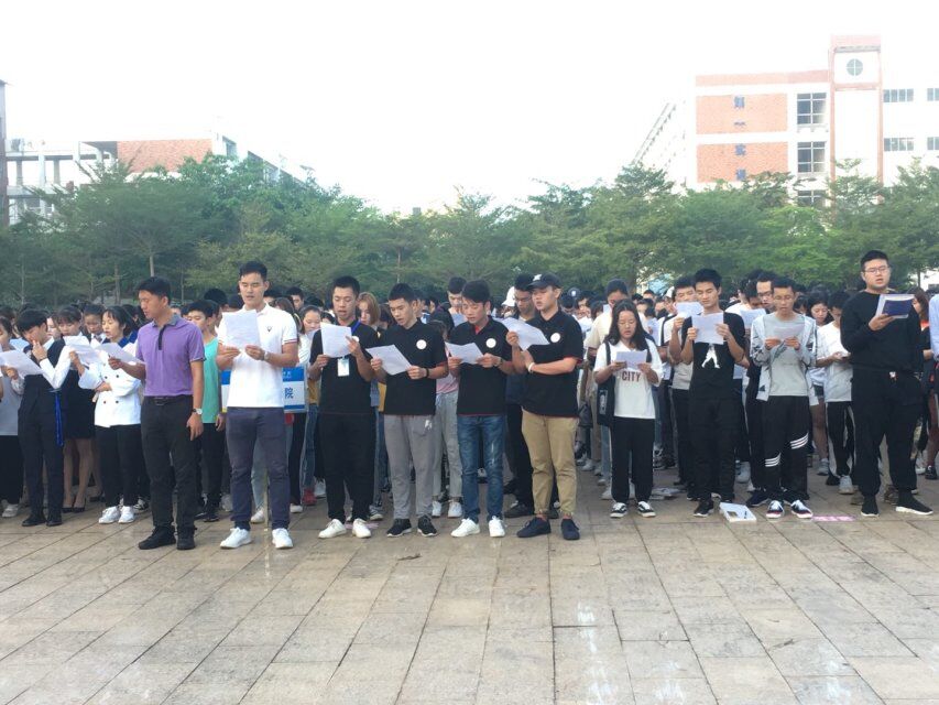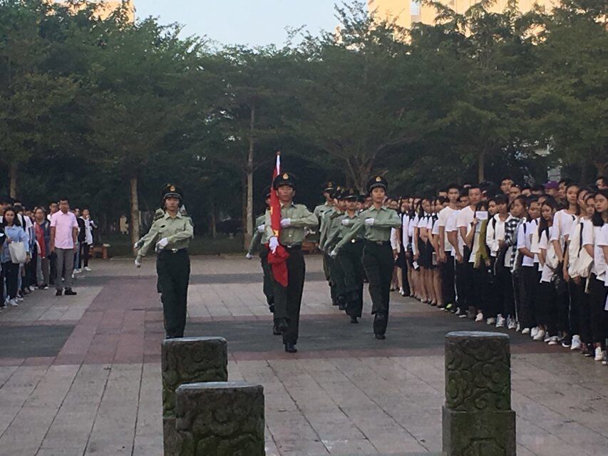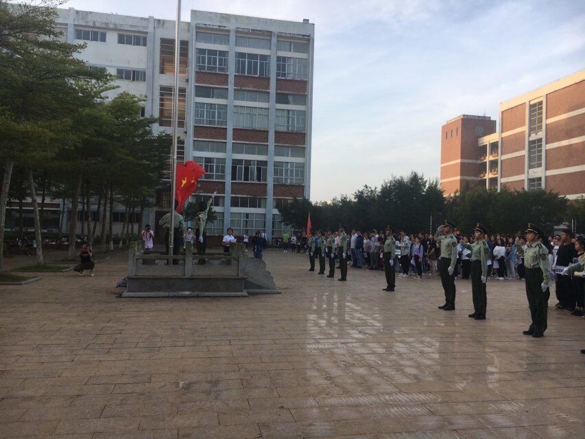 升旗仪式流程包括两项内容,依次是升旗仪式、宪法晨读。各班按照安排的位置,在经贸广场列队完毕。校国旗队着装干净整洁,迈着整齐的步伐朝国旗台走去,鲜红的五星红旗在全体师生的目光中缓缓升起。接下来,由领读宪法部分条款,师生跟读。