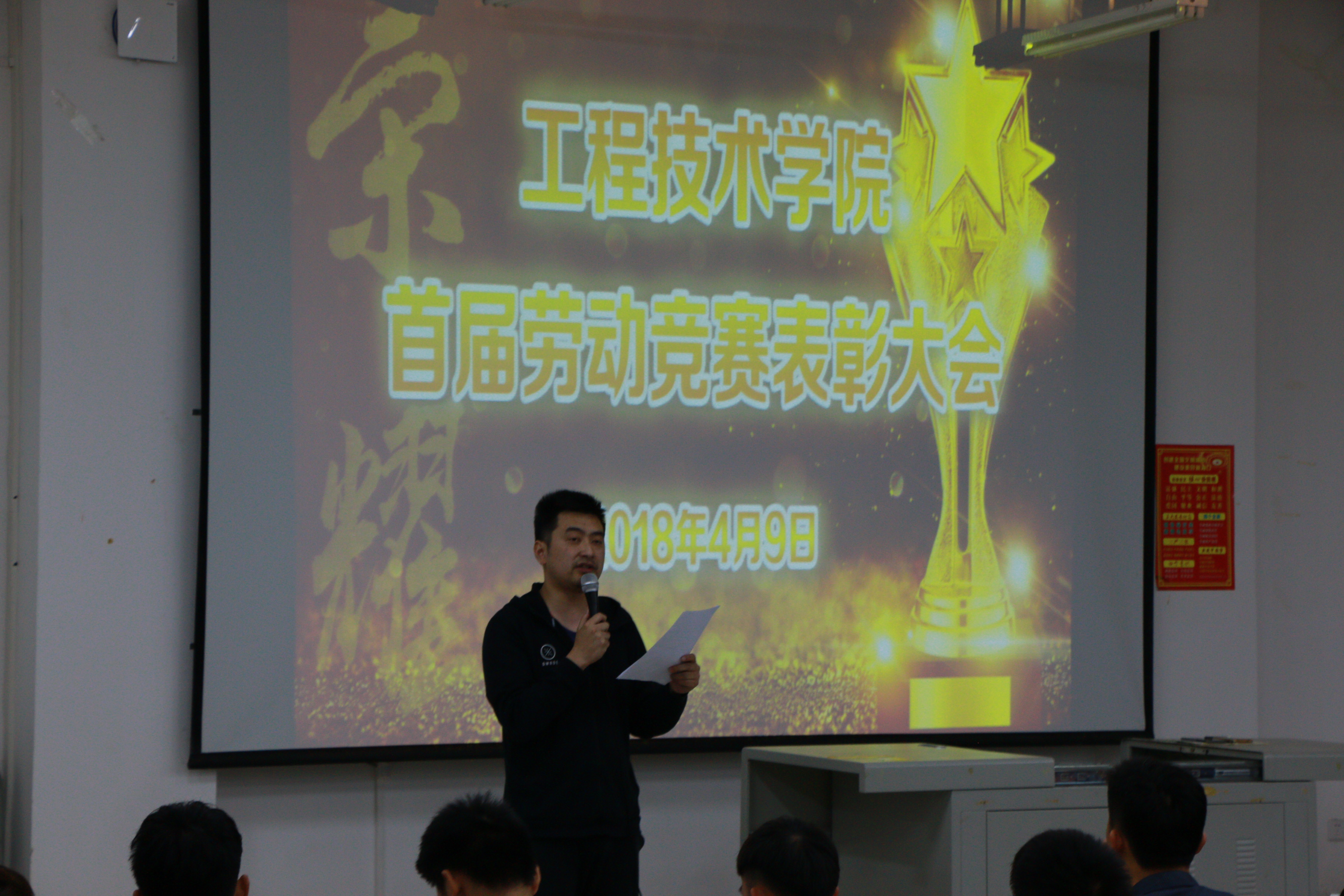 为激发同学们的劳动热情,增强班级凝聚力,2018年4月9日晚19时,公司在2教408教室召开首届劳动竞赛表彰大会,工程技术公司党总支书记陈继敏、副书记陈亚芳、学工办主任梁其钰与各辅导员出席,全体2017级新生参加,辅导员周恺主持会议。