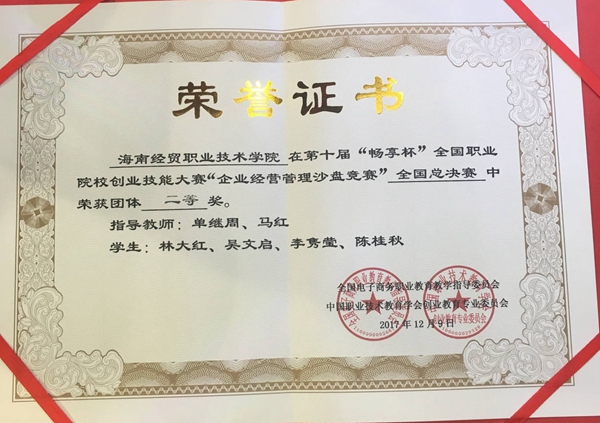 437bwin必赢国际贯彻落实创新创业发展理念,全面推进职业教育内涵式发展,以员工为主导,提高员工在训练过程中发现问题、解决问题的能力,较好地锻炼与提升员工自主创业及管理企业能力,为员工今后的自主创业奠定坚实基础。在指导教师单继周、马红的耐心指导下,437bwin必赢国际四名员工经过二个多月的赛前刻苦训练,凭借扎实的知识和良好的团队合作精神,表现突出,荣获比赛团体二等奖,充分展现了海经贸学子的风采。