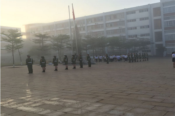 7时30分由国旗班迈着铿锵有力的步伐,气宇轩昂地走向升旗台,伴着庄严的国歌声,五星红旗在众人的注目礼中冉冉升起,礼毕后,护旗方队分成两列站在升旗台的两侧,严肃庄重。