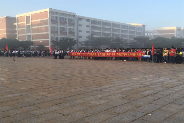 升旗后,主持人进行本次宣言,承诺:继承“一二、九”优良传统,全力支持“双创”工作,争做文明有礼担当时代青年,建立文明辅导小组,进行打造文明校园,严厉警告不文明行为,全力参与海口“双创”活动。让我们的校园能更干净更文明,做新一代的文明青年。