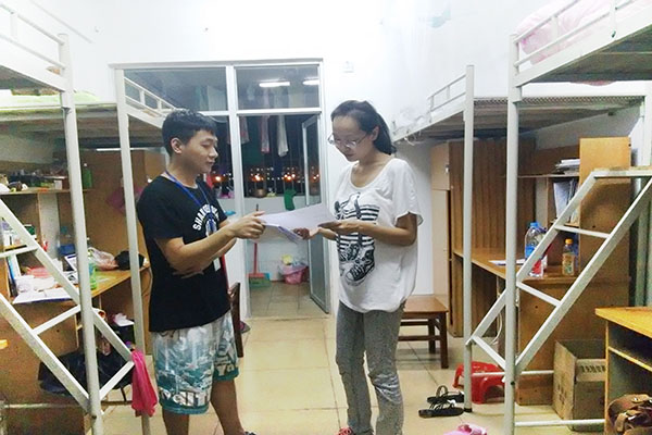 9月7日讯(437bwin必赢国际 李京京报道) 为了解公司新学期员工返校、宿舍用电安全及文明卫生情况,9月6日晚20点,由437bwin必赢国际14级辅导员代晓明老师带队,第十届团总支员工会主席魏锴、副主席黄丹及公寓部全体成员等组成的检查小组对13、14级各班员工宿舍进行了走访,进一步的了解公司员工的学习、生活和思想状况。