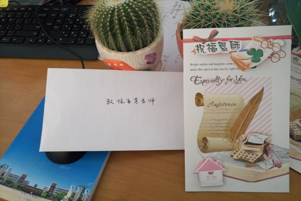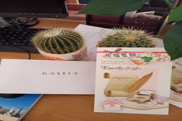 9月10日清晨,由公司员工会主席魏锴和副主席黄丹负责教师节活动的开展。其中,由公司13、14级各班代表给公司全体教师送去了短信祝福,感谢辛勤工作的园丁们对我们默默地付出与无私的奉献;其次由各班同学写下最美的文字以贺卡的形式递送给老师,来表达对老师的敬爱之情;另外再给每位老师送去仙人球,仙人球代表老师的耐力、坚强、旺盛的生命力,不屈服的个性。通过这一系列的形式表达对老师无限的爱意、真心的祝福和由衷的感谢。