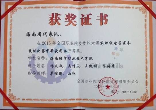 全国职业院校技能大赛是由教育部主办的级别最高、规模最大的国家级职业技能比赛。公司代表队在2015年海南省职业院校技能大赛(高职高专组)电子商务技能赛项中荣获第一名,代表海南省出征本次大赛。本次竞赛采用先进的电子商务网络模拟训练模式,以网店开设装修、网店运营推广、网络客户服务、网店经营分析四个关键任务完成质量以及选手职业素养作为竞赛内容。