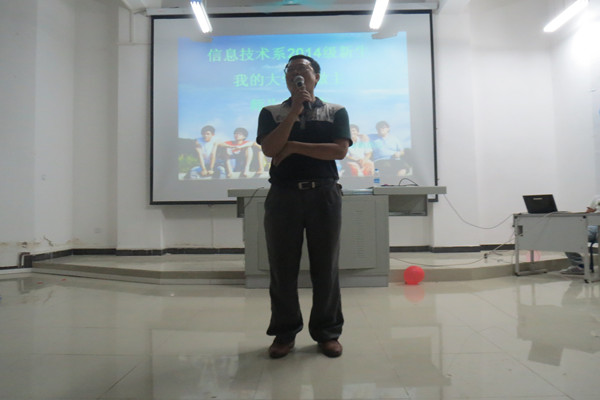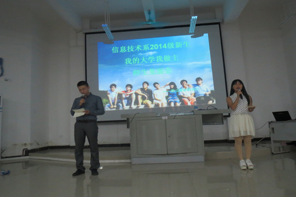 本系9月12日讯(信息技术系 丁燕琴报道)9月11日晚7:30,我系在2-408教室举行了以“我的大学我做主”为主题的2014级新生见面晚会,出席嘉宾有:我系党总支书记陈继敏书记、系学工办主任陈亚芳老师、系主任王忠老师、系办公室主任周波老师、系教学秘书吴明珠和韩昌豪老师、系学工办副主任梁其钰和刘露思老师、系副主任王凡帆、计算机网络技术专业负责人王岩、电子商务专业负责人单继周、计算机多媒体技术专业负责人李兵、辅导员龙腾老师。其中由员工会全体人员和14级各班代理班主任进行布置现场以及维持现场秩序。