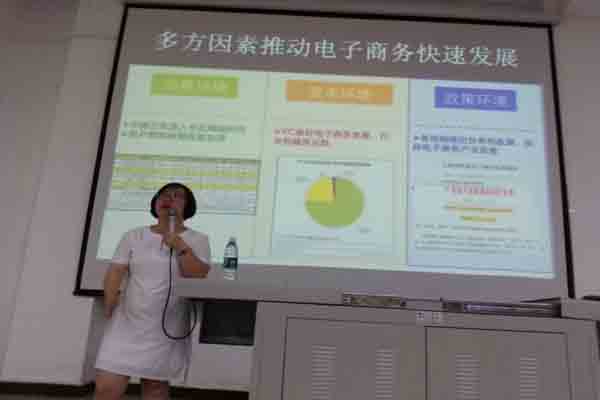 孙总首先对电子商务模式B2B、B2C、C2C、C2B、B2B2C、O2O进行了讲解;接着从消费、资本、政策方面诠释了电子商务的快速发展;紧接着对贵公司的部门职能(其中包括客服、物流、市场、运营、数据、产品部)、薪酬(底薪+福利待遇+提成+奖金)进行了介绍。其后并向同学们分享了贵公司2012年的“AFU阿芙”案例,孙总借此案例总结出:要成为一个出色的电子商务工作人员必须会“做ppt、说故事、设计流程,还要会总结”。