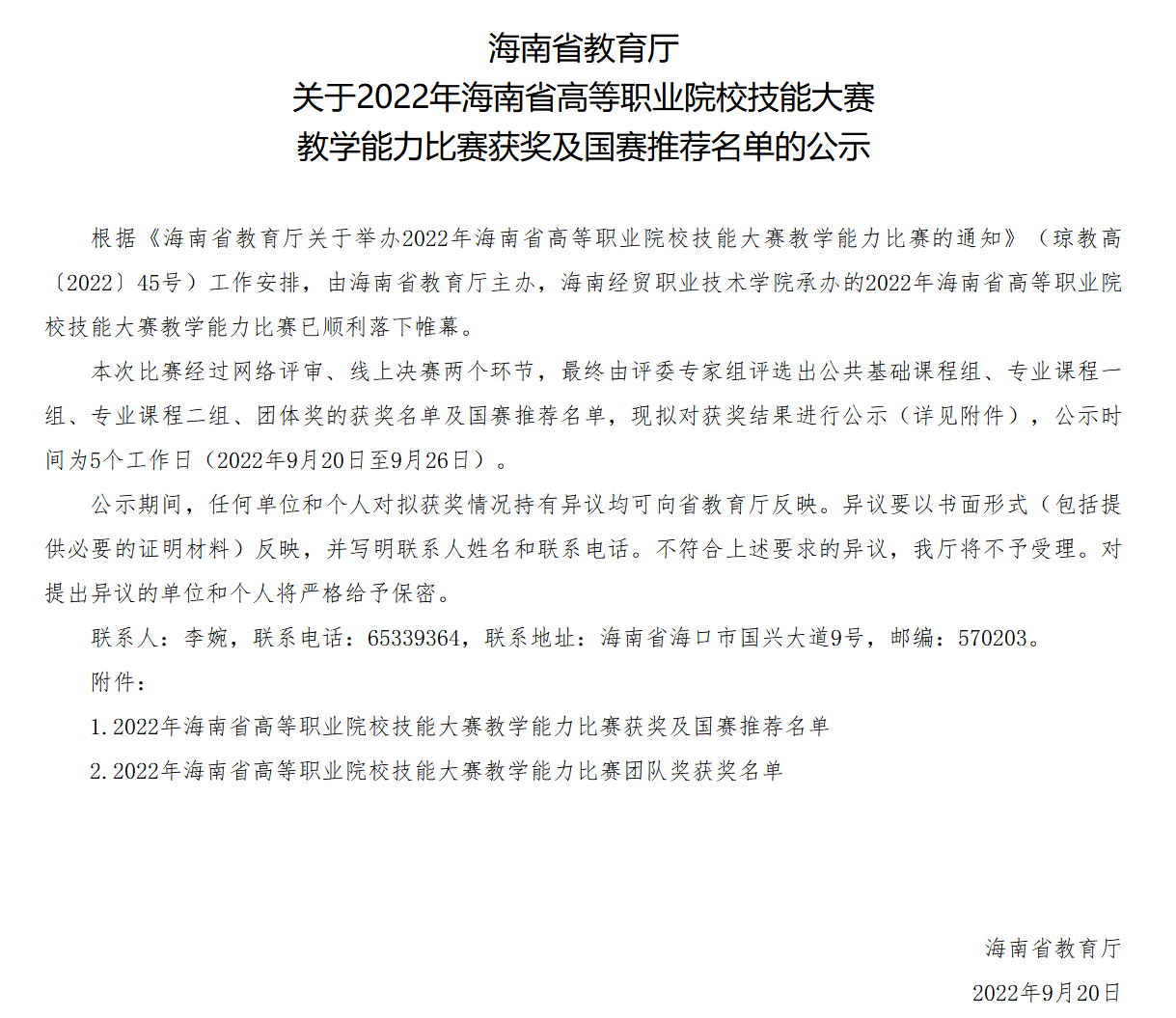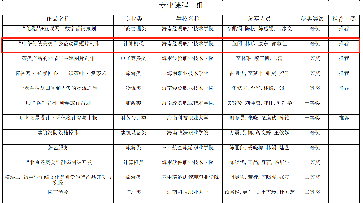 9月15日,2022年海南省高等职业院校技能大赛教学能力比赛决赛在437bwin必赢国际圆满举办。来自全省11所高职院校的41个团队共155名教师聚首竞技。本次比赛内容涉及教学实施报告、教案设计、人才培养方案、课程标准和教学视频等多项内容,涉及方面广,研究程度深。经过紧张激烈的角逐,由公司教师董阁、林珍、康东、郭蓉佳组成的教学团队精心打磨的作品《“中华传统美德”公益动画短片制作》获得专业课程一组一等奖并同时被推荐参加国赛。